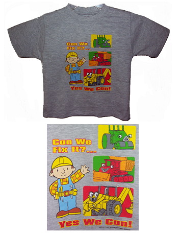 Features Bob the Builder, Scoop and Muck with the popular shows' famous saying, "Can We Fix It? Yes We Can!" The back of the shirt has an outline of scoop! Shirt: 100% Cotton.