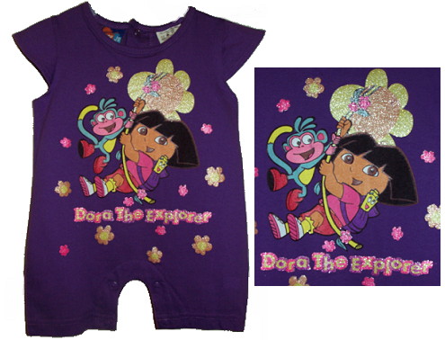 This adorable one piece shortall set features dora and boots swingin'! Surrouned by sparkly glittered flowers! Wording under the picture, "Dora the Explorer" 3 back snaps and 4 snaps between the legs for easy on and off.