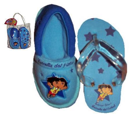 This fantastic Set features a pair of Dora the Explorer Slippers AND a pair of matching thongs! Both come in a great see through carrying case! Slippers are two toned blue and are very soft. They have Dora on the front with the wording "Estrello del Futboll" (Soccer Star!) Non skid rubber bottom.