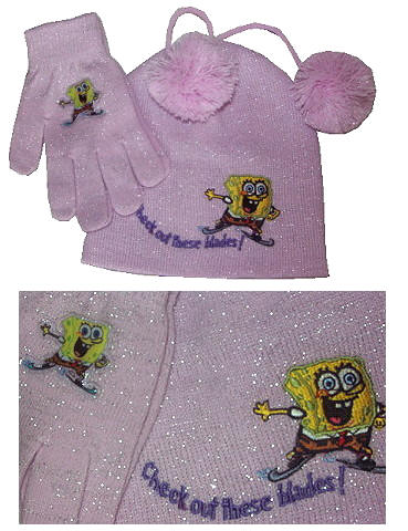 Sparkle, Sparkle! This great hat features Spongebob on front of the hat with the wording " Check out these blades!" Spongebob is on ice skates. Two long strand pom-pom's adorn the top. Silver metallic threading throughout the hat and gloves for a sparkle effect. One size fits all : Child to Small Adult.